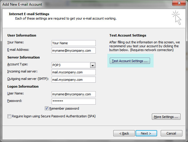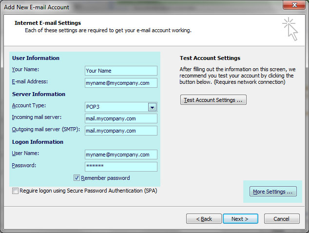 • Depending upon your ISP, your incoming & outgoing settings should be mail.mycompany.com ("mycompany.com" is an example - enter your own domain name). **If you receive errors from the outgoing setting - you may need to change it to your ISP's outgoing email setting.