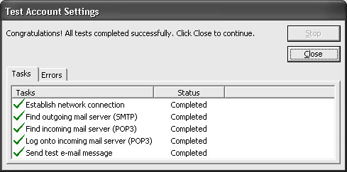 If you successfully tested your account settings then click the "Close" button. In the prior window, click the "Next" button and then click the "Finish" button in the final window. You're ready to e-mail your friends.
